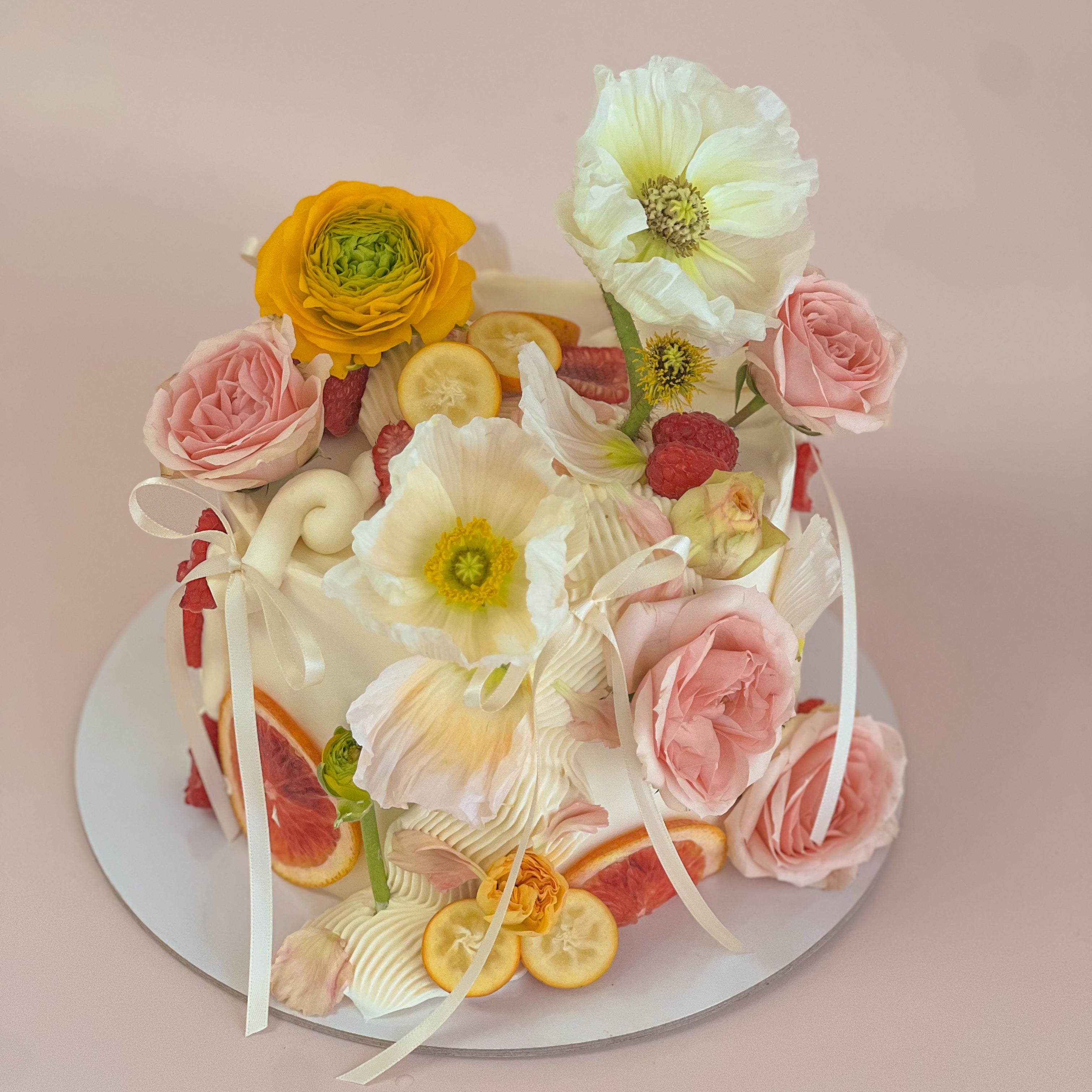 A trendy and artful creation using fresh flowers, fruit and artistic piping styles. This cake will be 100% unique and seasonal based off of the colour you choose. Seasonal flowers are always changing and we are not able to guarantee any one type of flower or fruit.