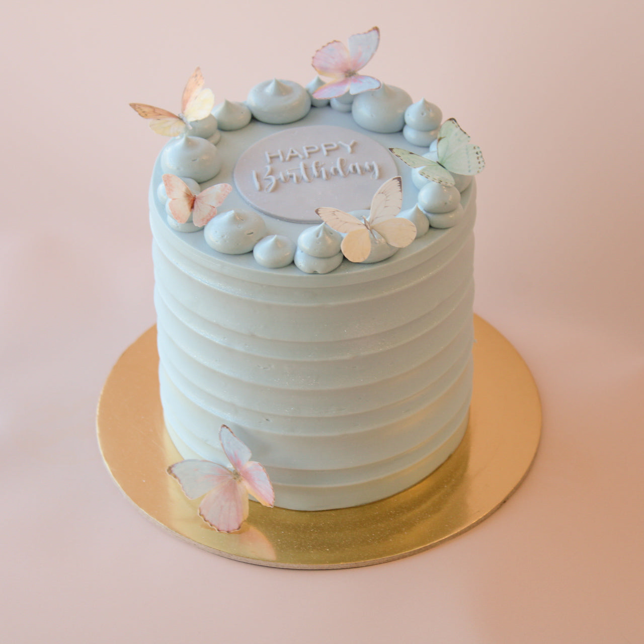 A whimsical buttercream cake with ribbon buttercream, and edible wafer butterflies. Available in your choice of flavour, as well as the colour of buttercream can be customized.