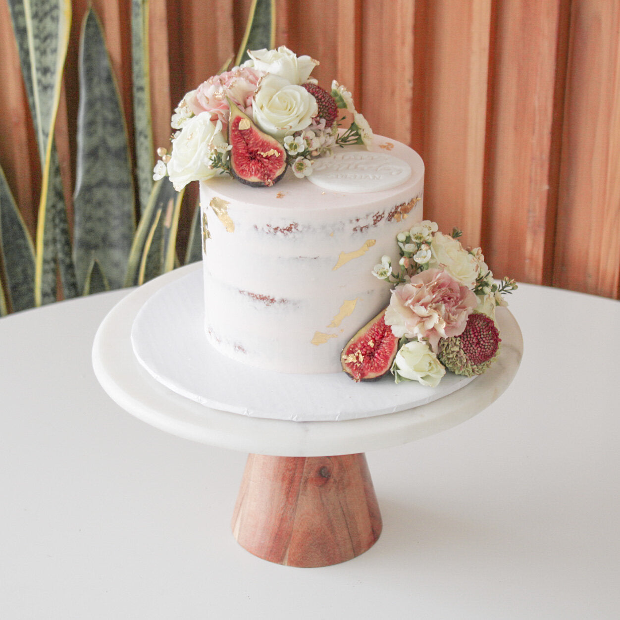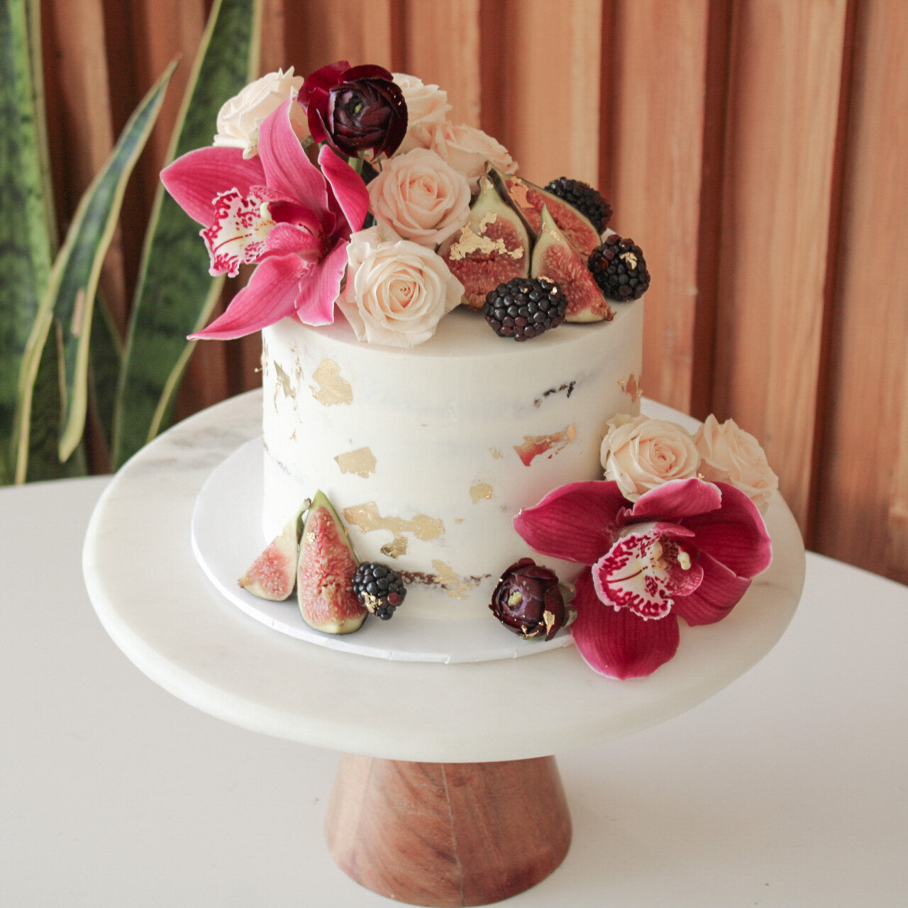 Cakes with fresh flowers should be collected the day of your event, and no earlier. Fresh flowers last up to 12 hours on cake being out of water.