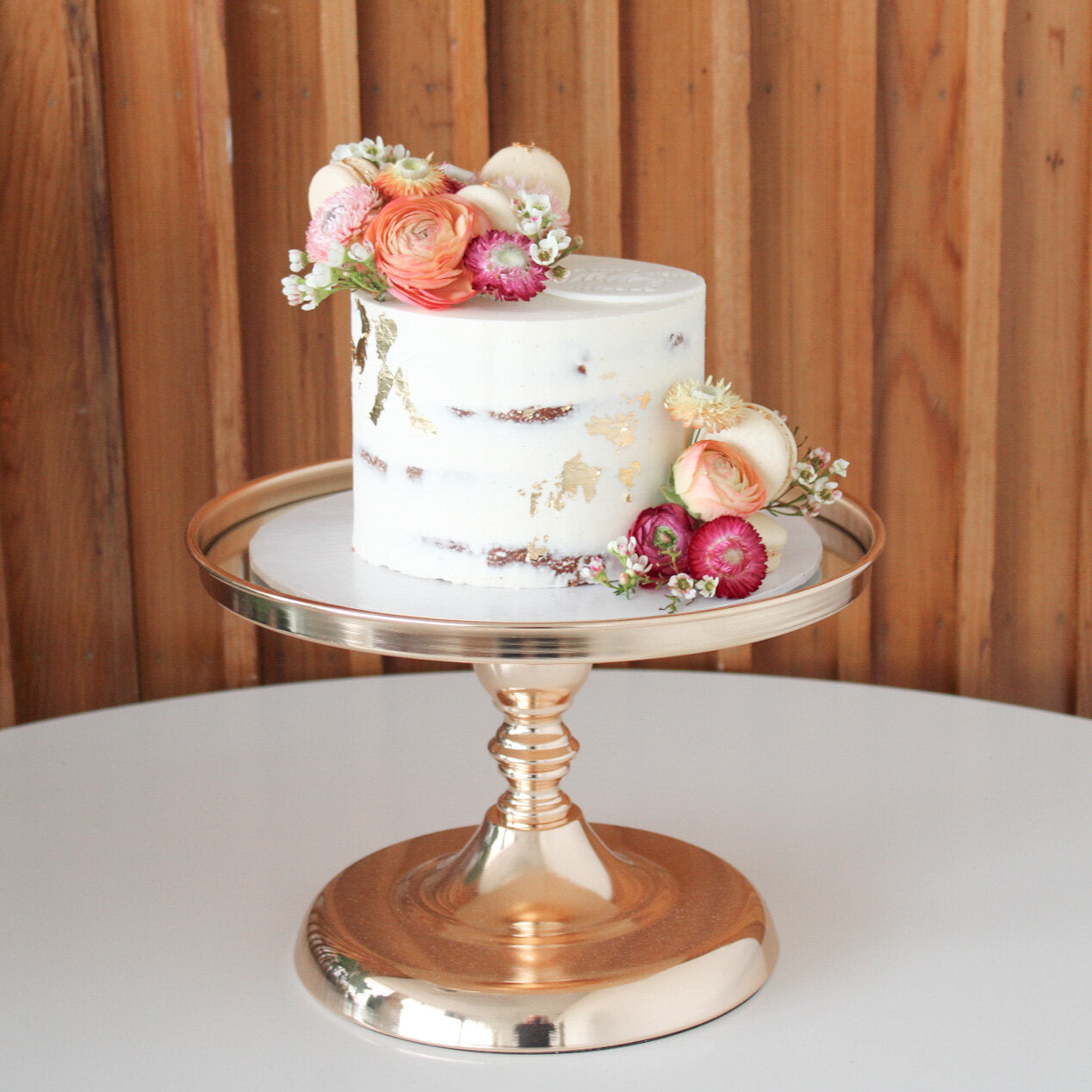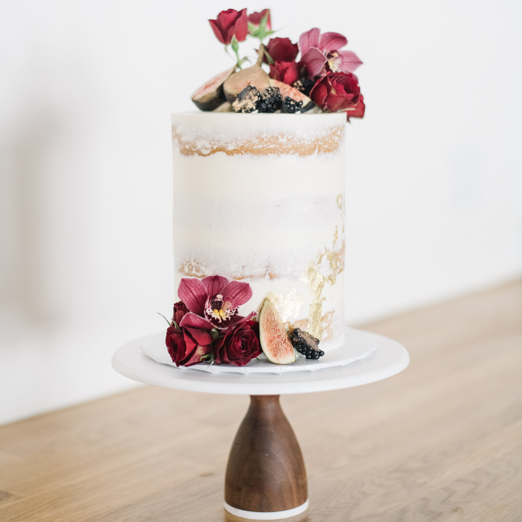 A rustic semi-naked buttercream finished cake, with a selection of in-season fruit and flowers with a splash of gold!