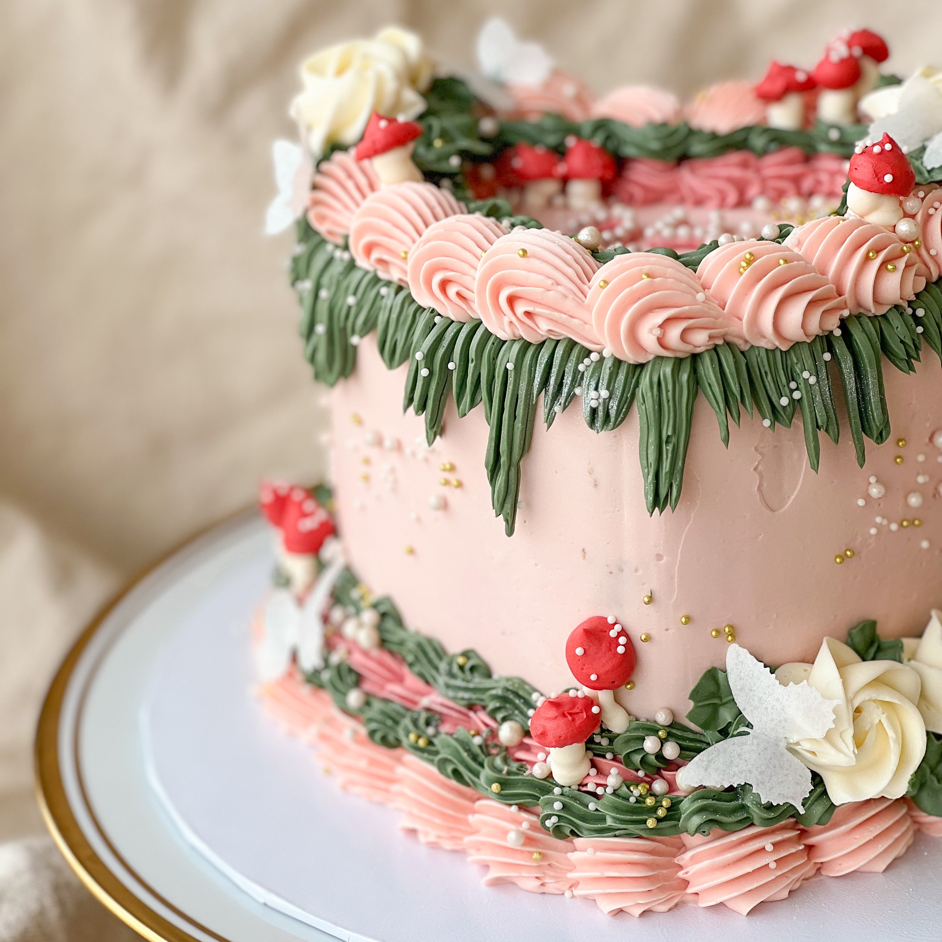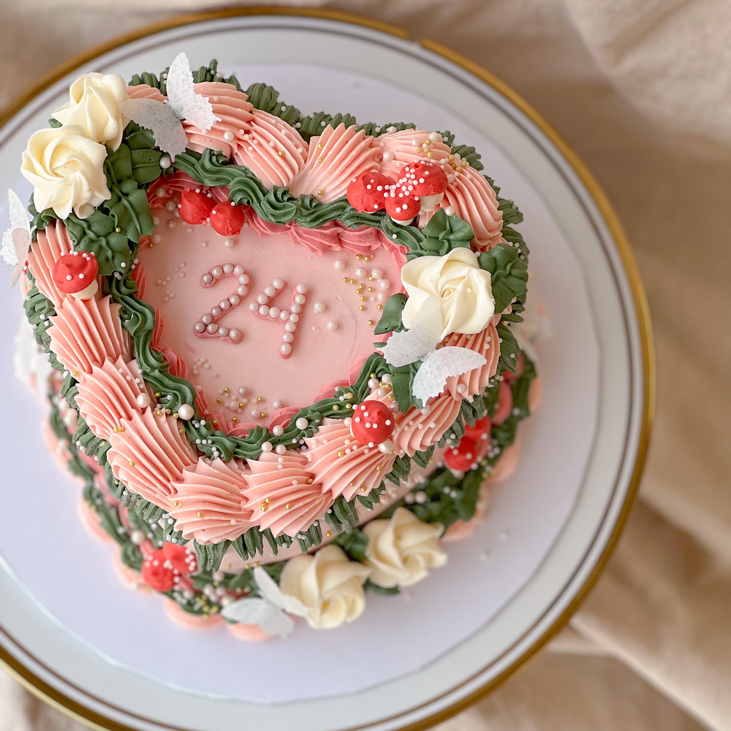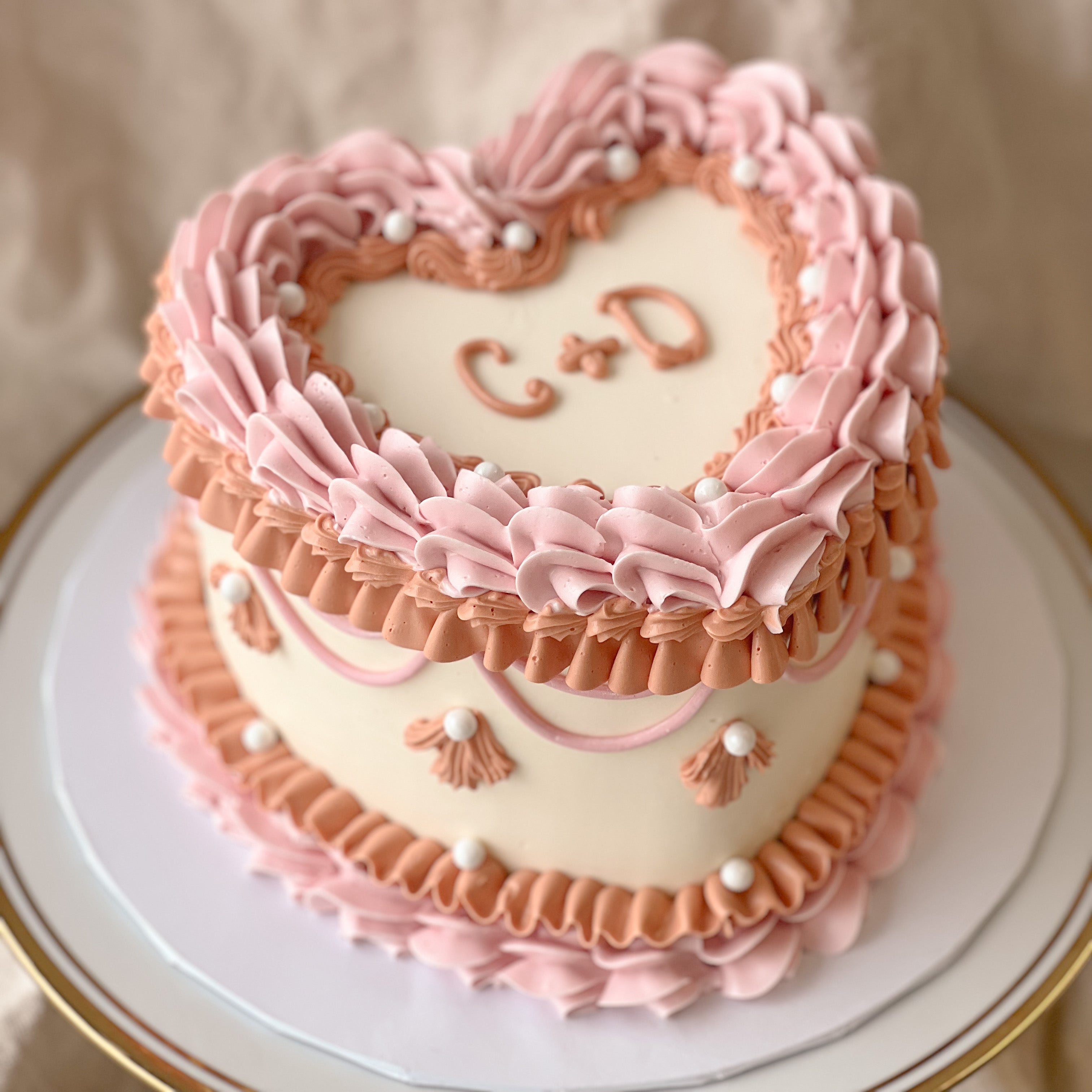 A classic vintage cake design in a unique heart shape with excess buttercream piping, frills, and gold. Available in any of our signature flavours, and you choice of colours.
