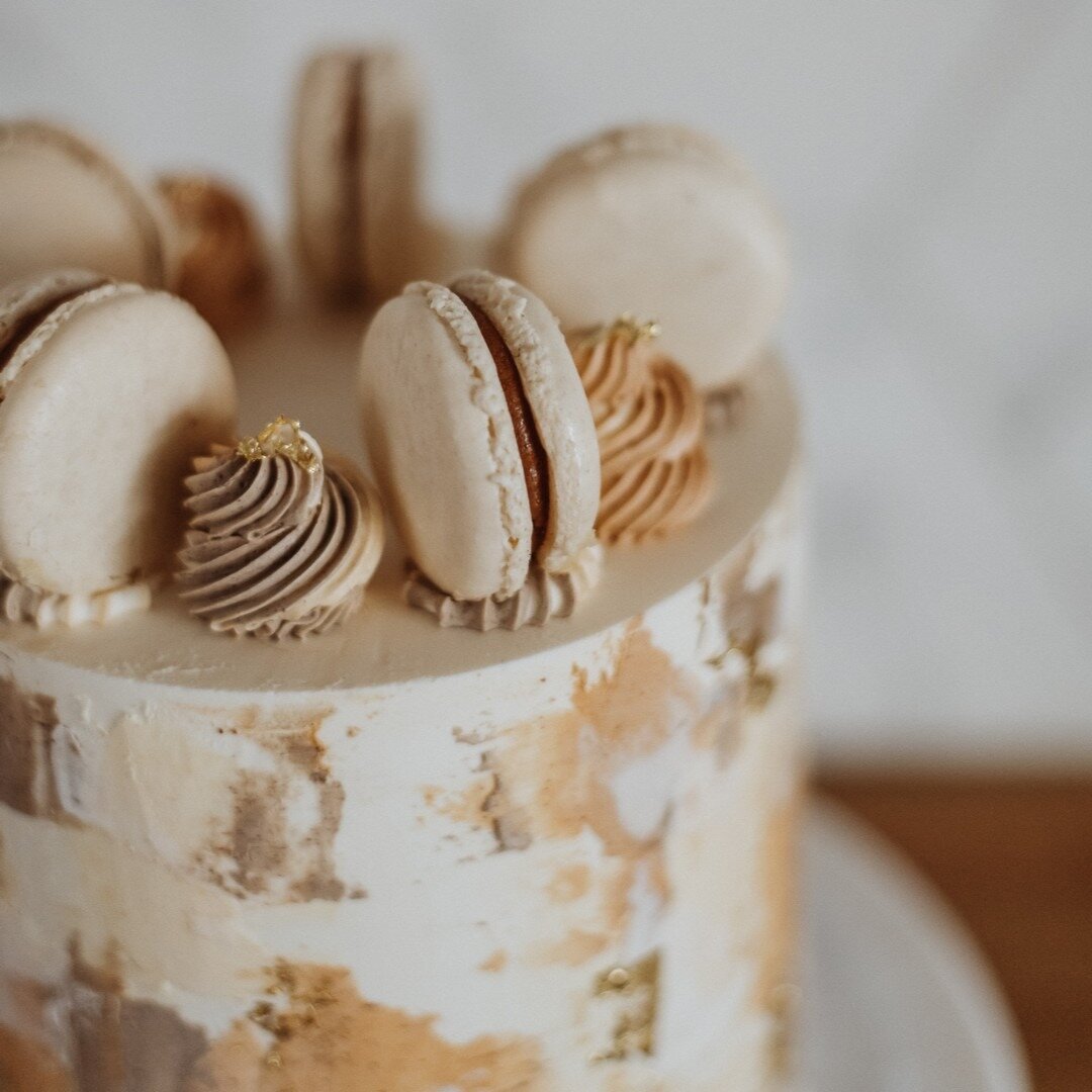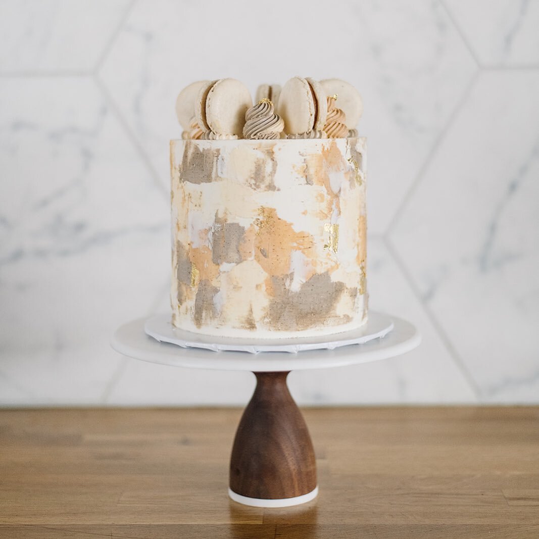 A beautiful and unique buttercream cake. This cake can be finished in your choice of 2-4 different colours. Each cake is topped with a selection of matching french macaron.