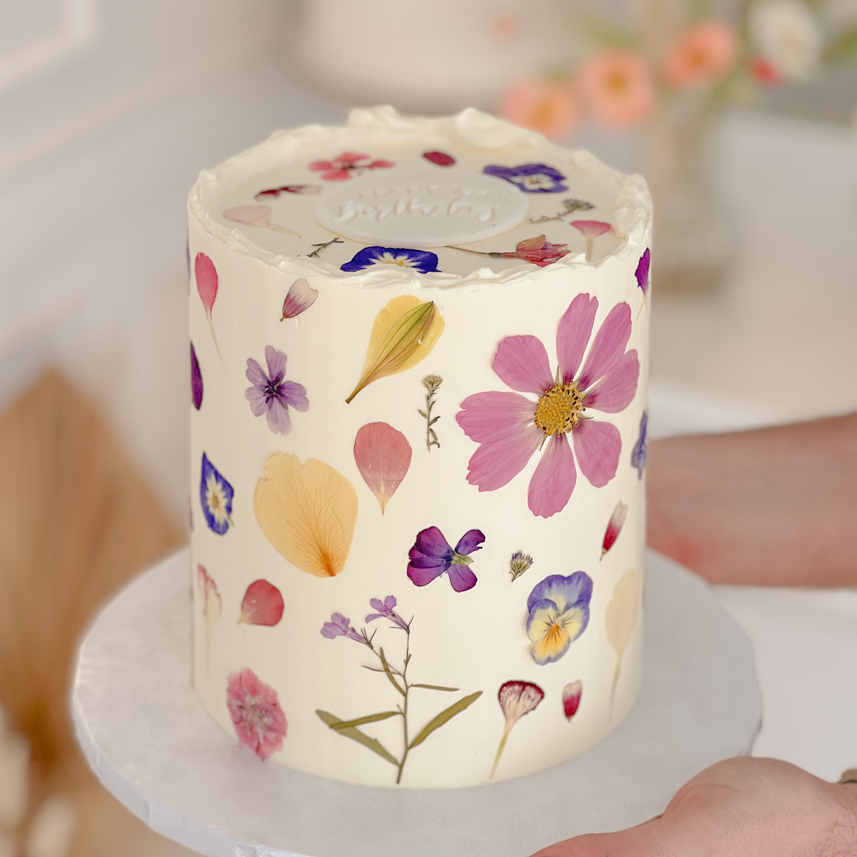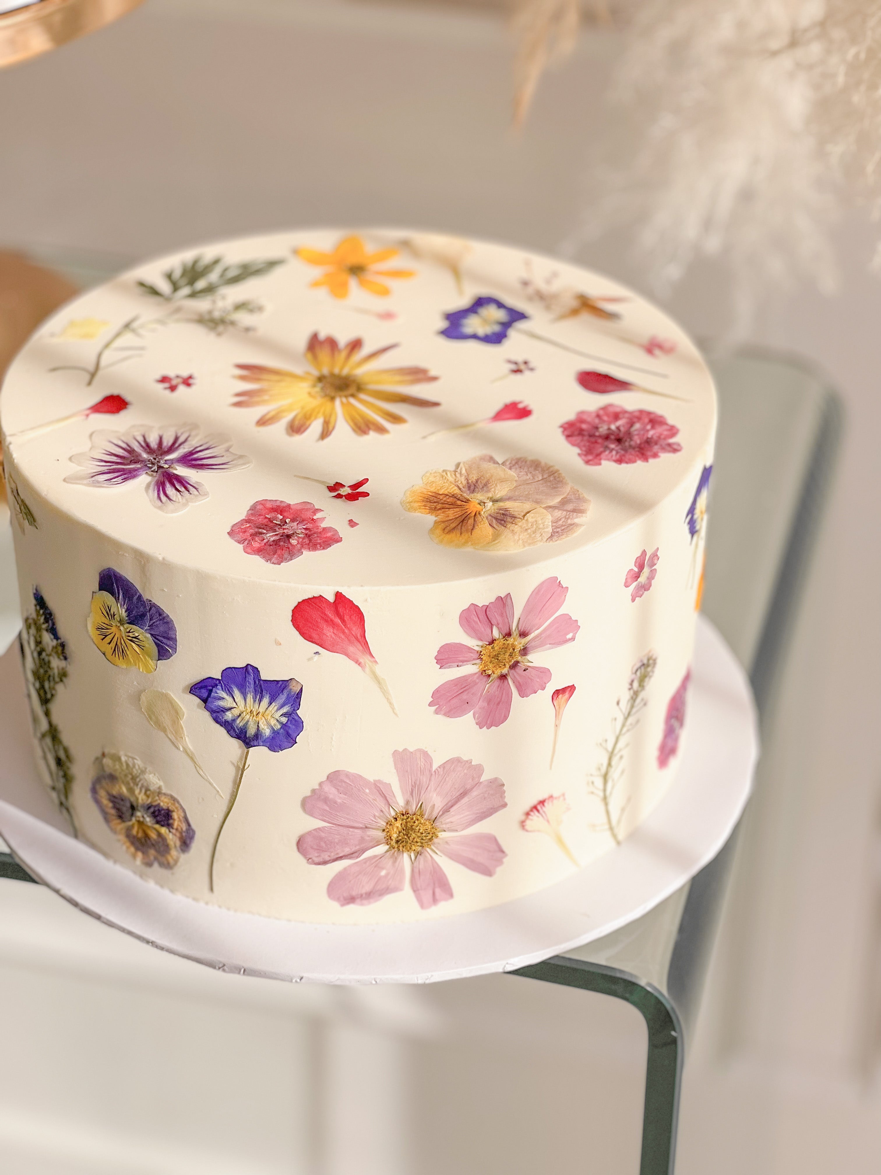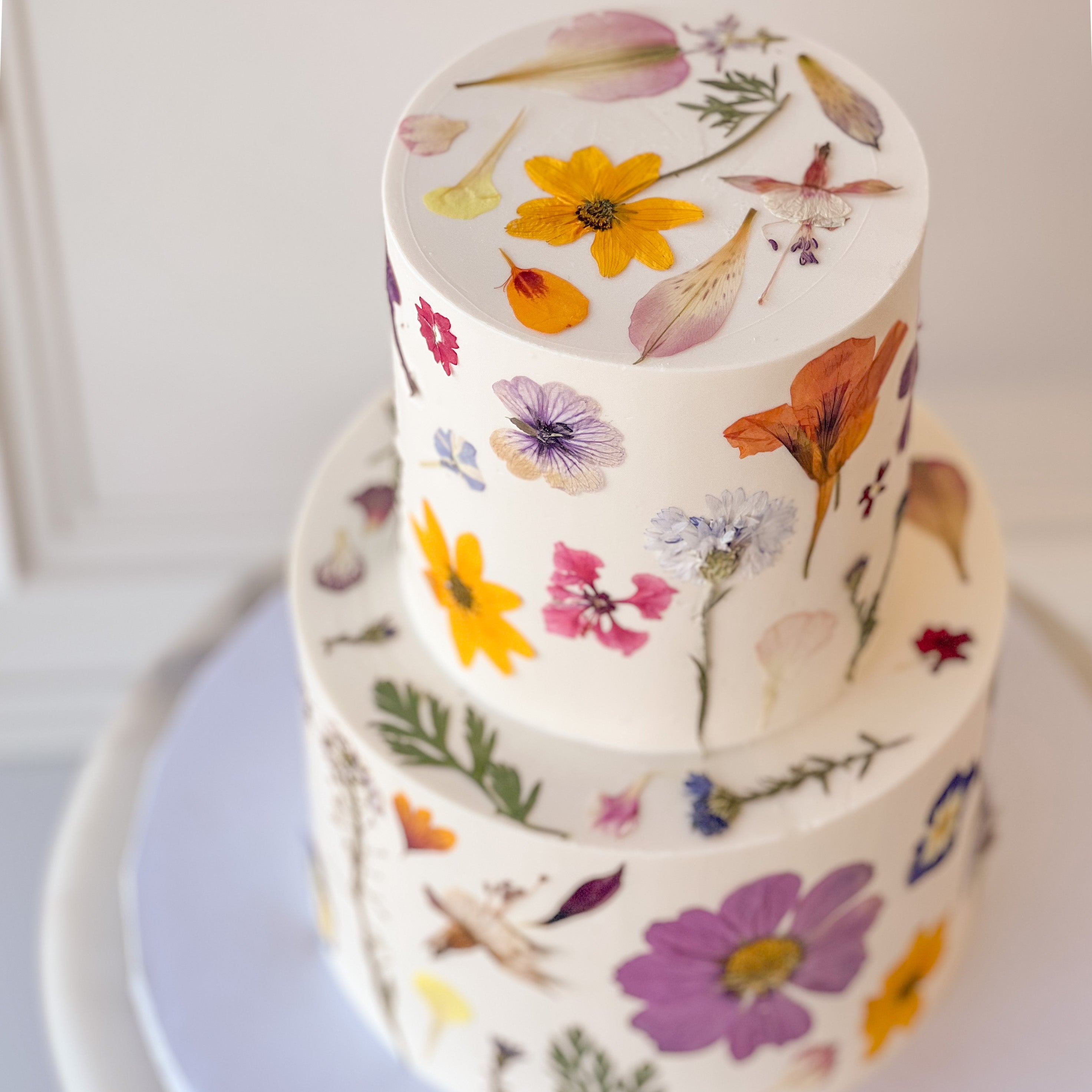 A natural and beautifully unique design perfect for any event. The colours of the flowers on this cake are subject to seasonal availability and cannot be customized. Colour request above will be used for the colour of the buttercream, not flowers.