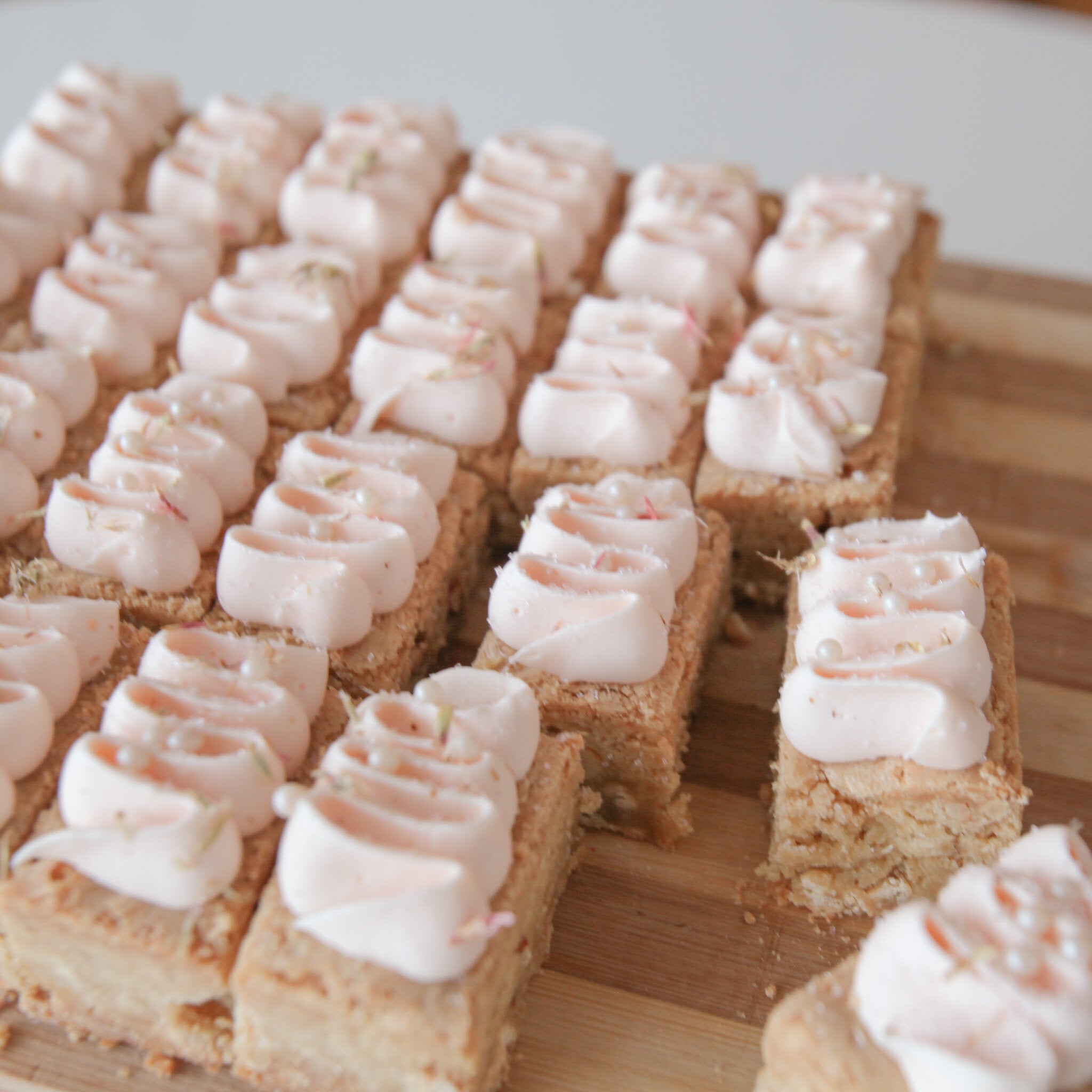 A dense and delicious little white chocolate bite, topped with buttercream, sprinkles, and edible flowers. The colour of the toppings is customizable for this item. Blondies contain pecans, and cannot be made without.