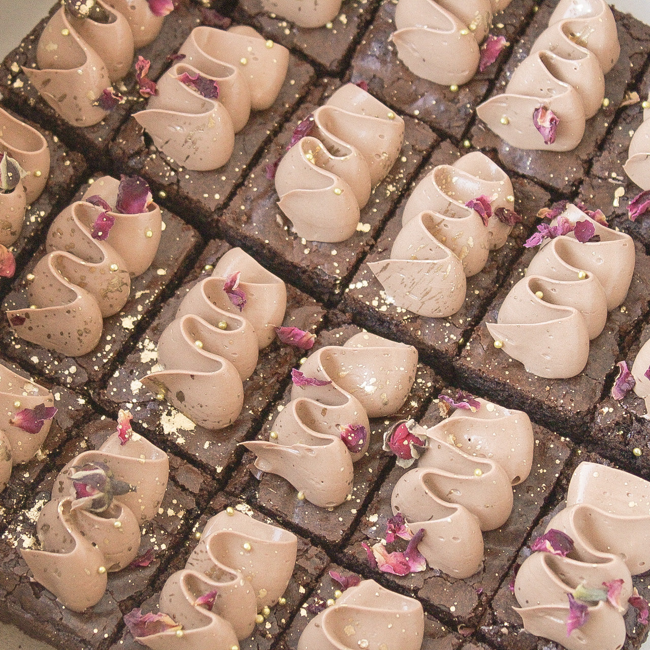 A dense and delicious little dark chocolate bite, topped with chocolate buttercream, sprinkles, and edible flowers. 1 order of brownies comes with 24 minis.