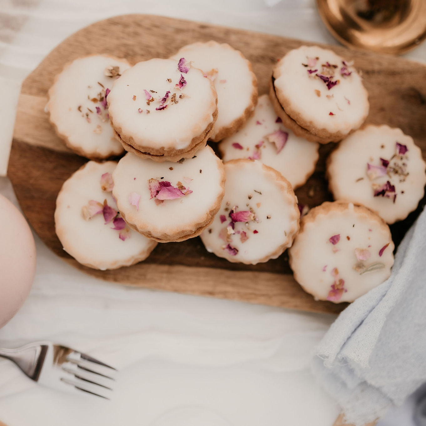 The cutest little shortbread sandwiches. Perfect addition to a dessert bar or afternoon tea. These cookies are our spin on the ever loved imperial shortbread sandwich. Classic buttery shortbread, fresh raspberry jam, and rose water glaze. topped with freeze dried raspberries and rose petals.