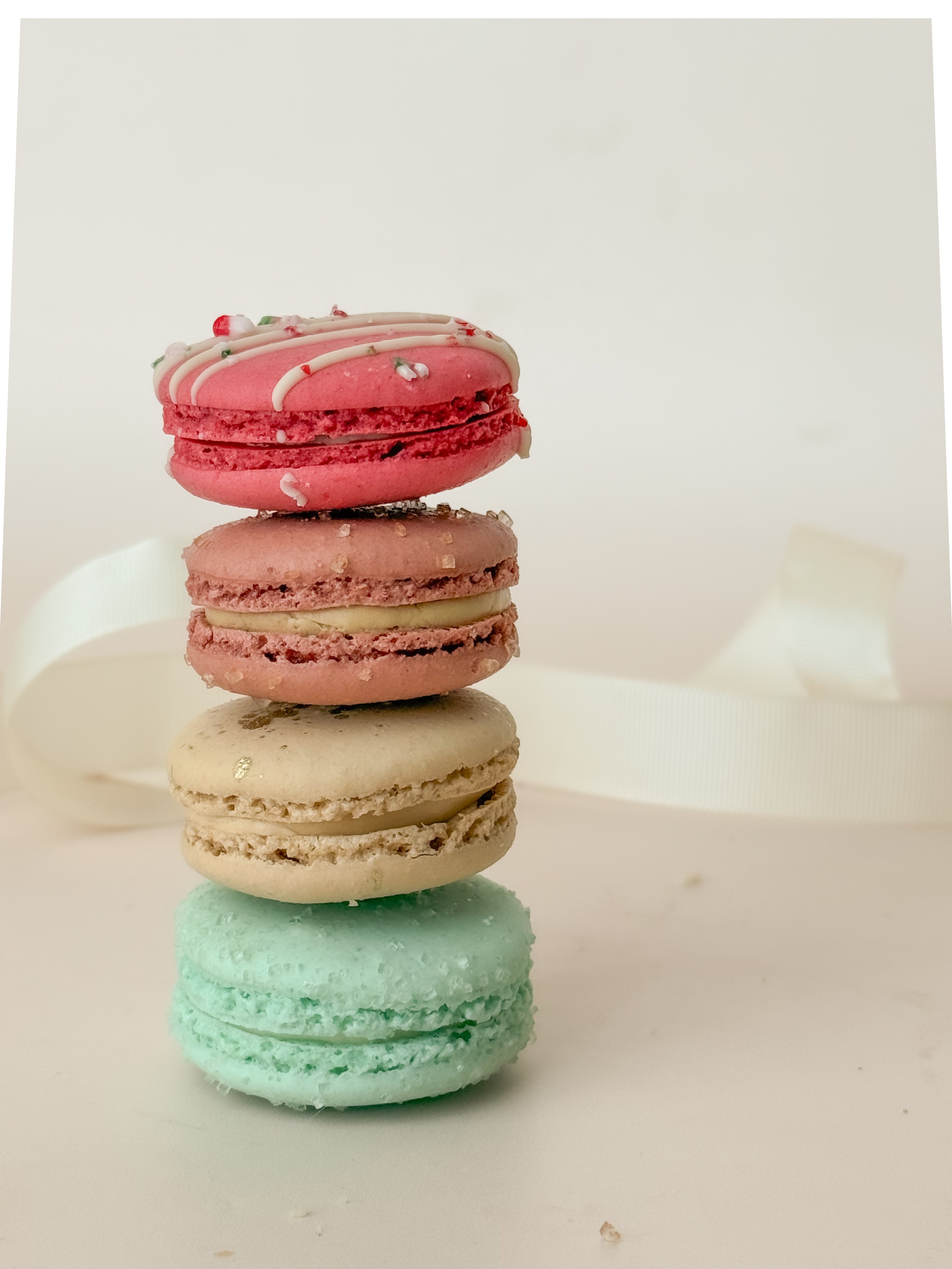 4 Holiday Macarons, egg nog, gingerbread, candy cane, Salted caramel. (GF)