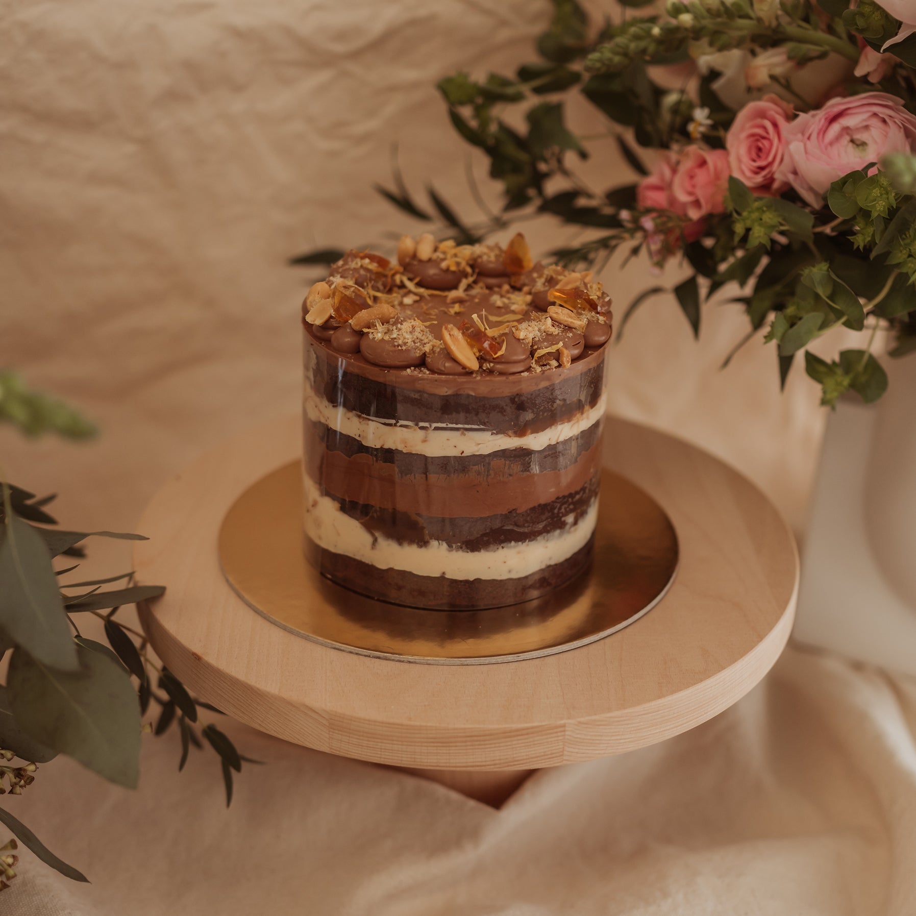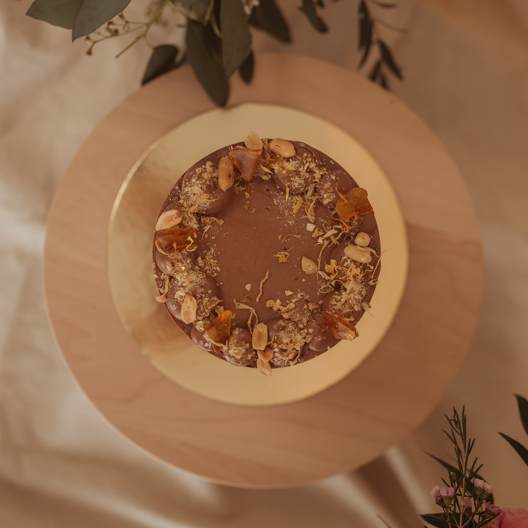 A Wild Rose Cakes signature chocolate cake with 4 layers of dark chocolate mud cake, 2 layers of peanut praline buttercream, a layer of dark chocolate ganache, and chocolate buttercream. Topped with chocolate buttercream piping and peanut praline.
