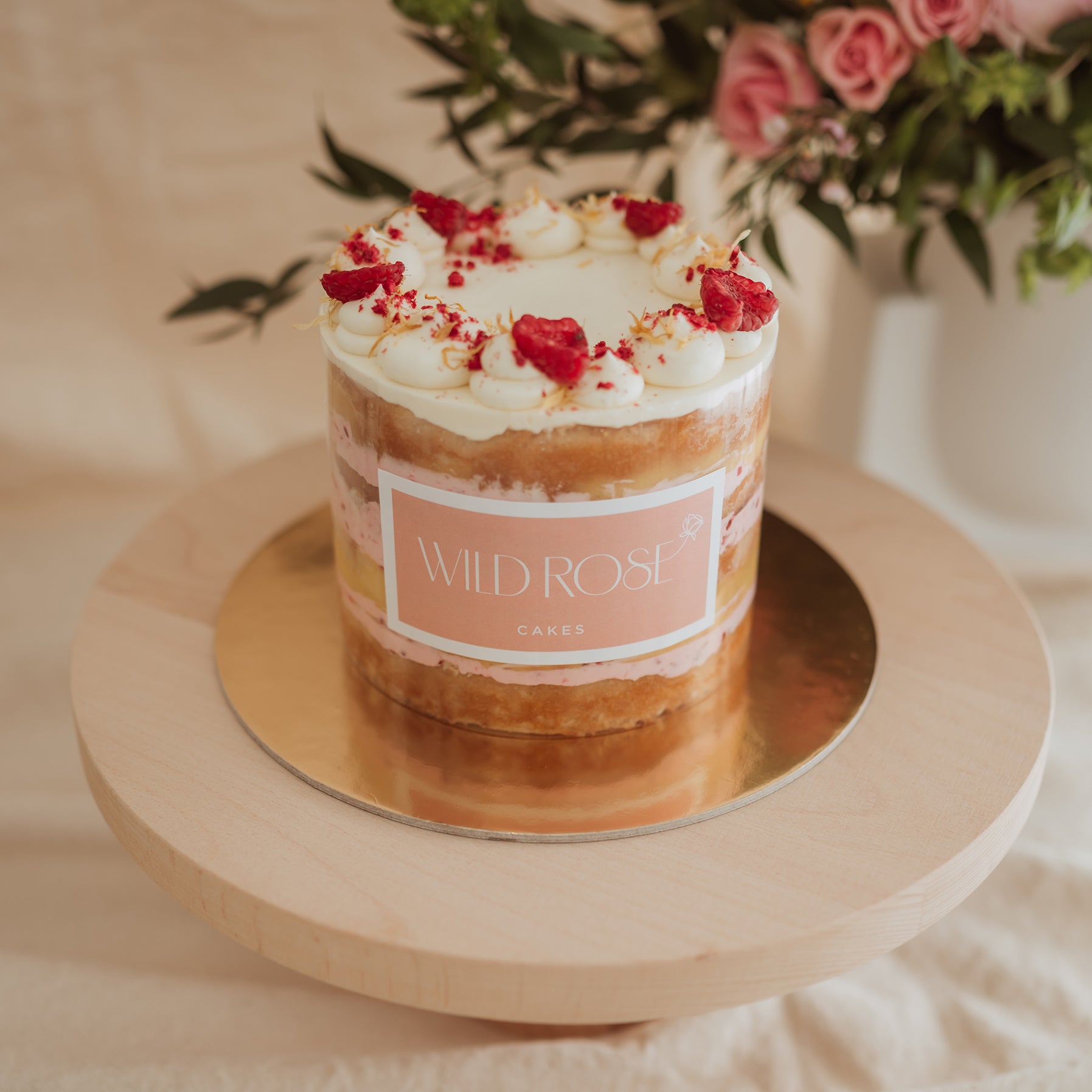 A Wild Rose Cake Signature flavour, Coconut Raspberry Passionfruit. 4 Layers of coconut butter cake, with 2 layers of fresh house-made passionfruit curd, and freshly crushed raspberry buttercream centre. Topped with piped vanilla buttercream, edible flowers and fruit.