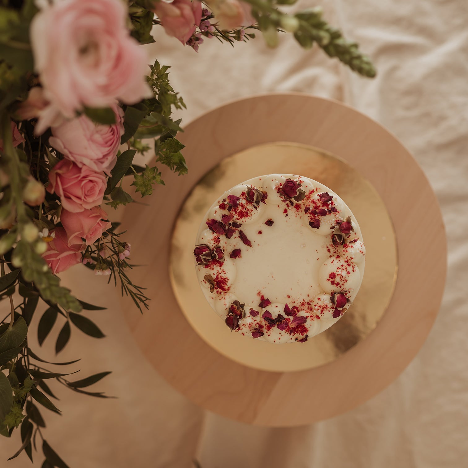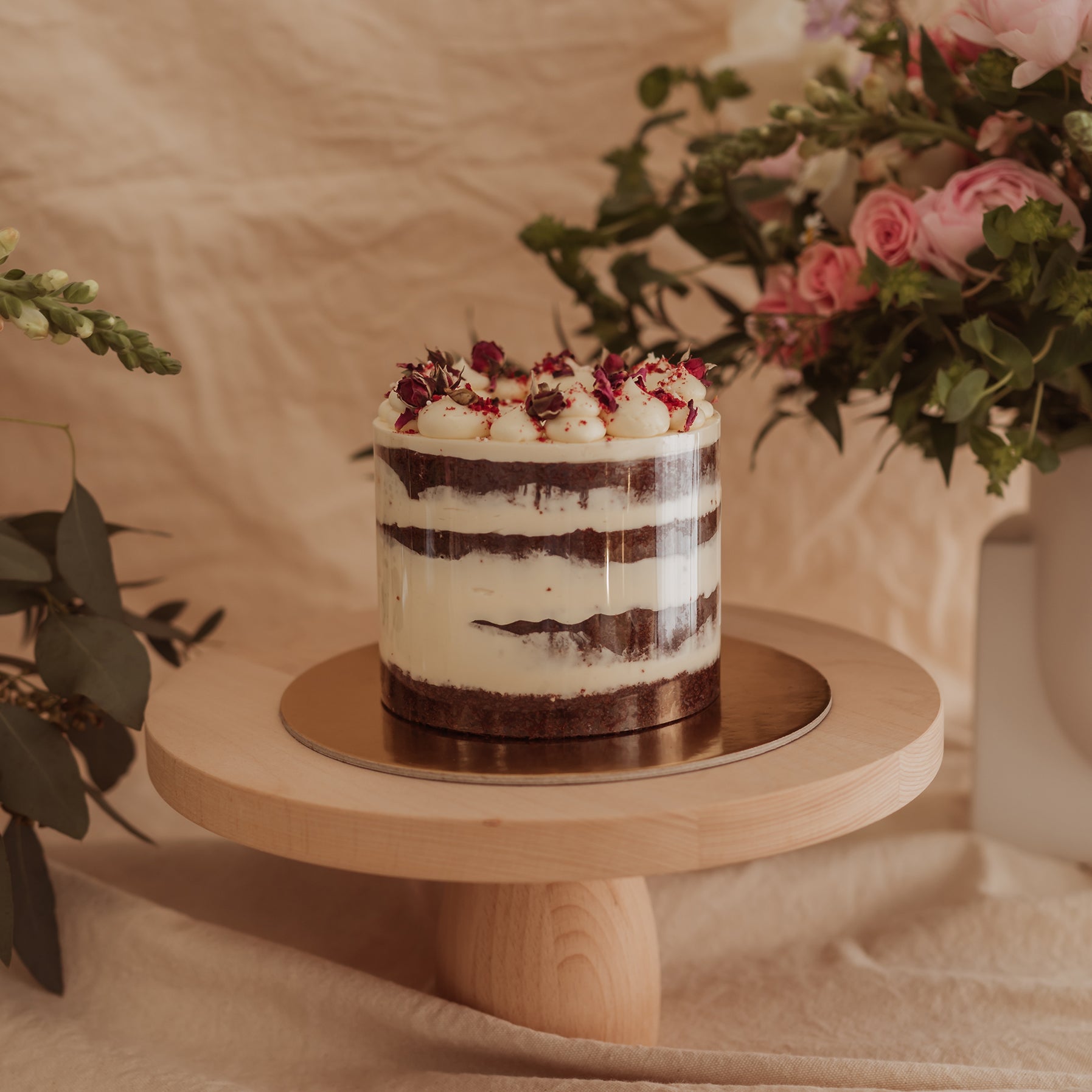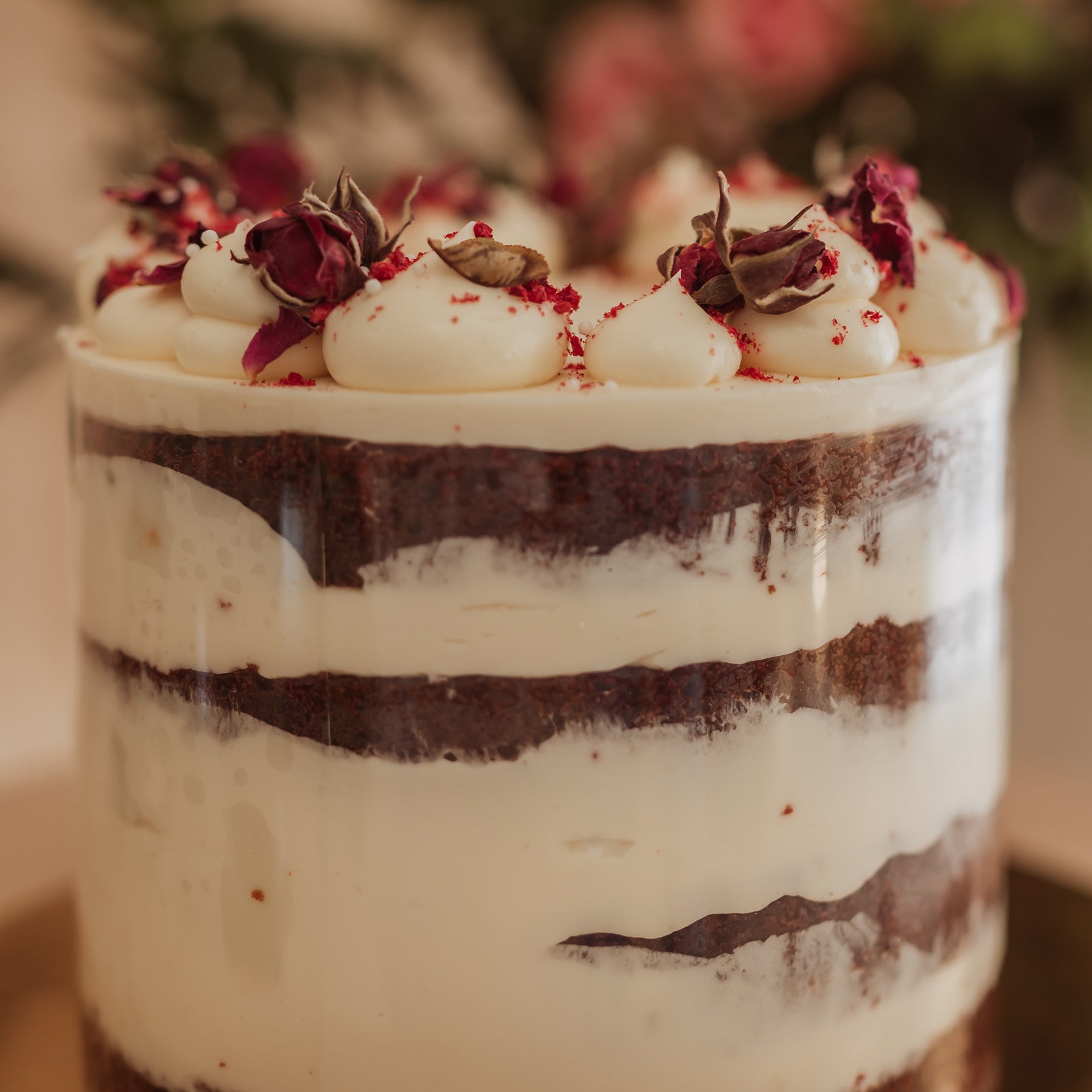 A signature Wild Rose Cake flavour. 4 layers of moist american red velvet cake, and 3 layers of cream cheese swiss meringue buttercream buttercream.