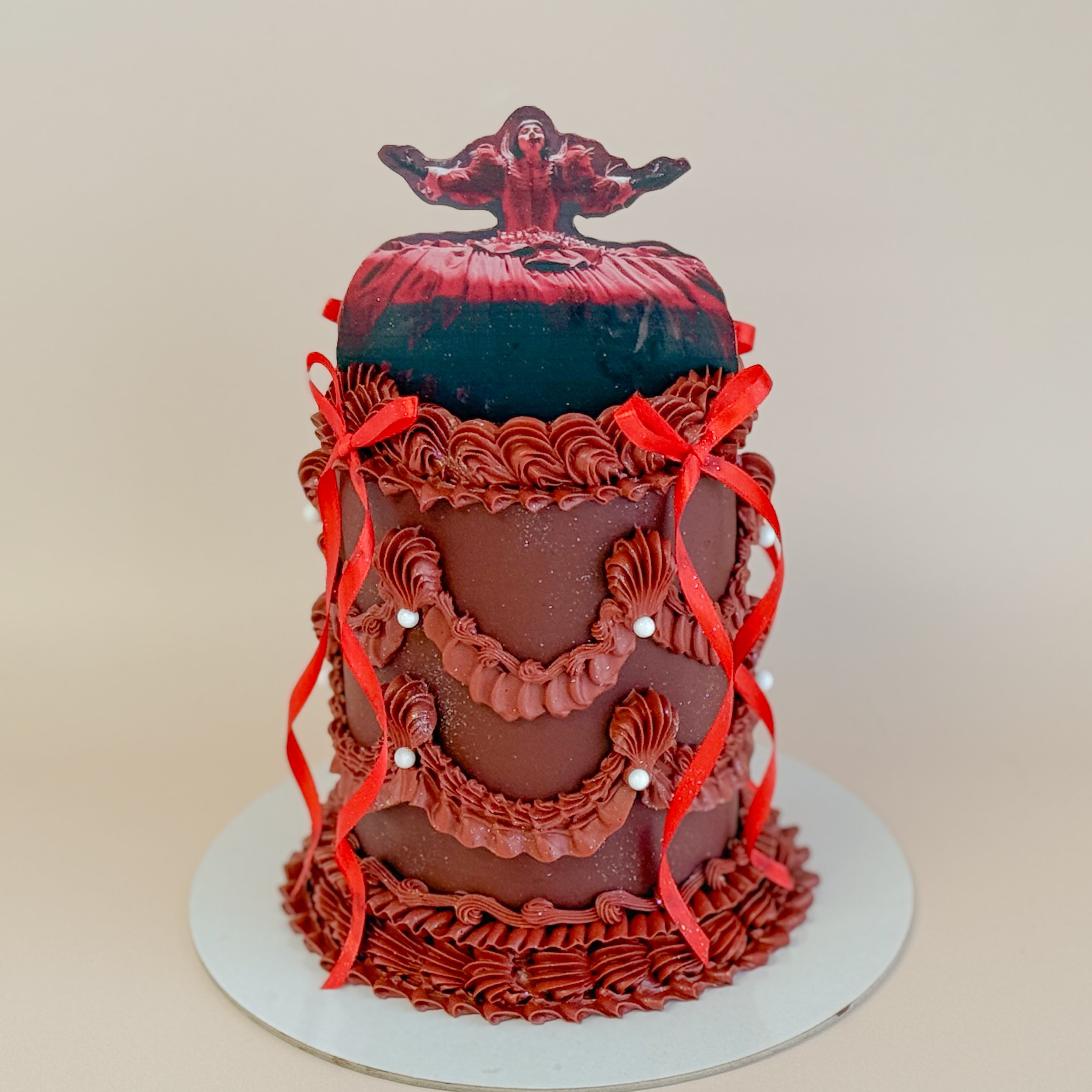 A classic vintage cake design with excess buttercream piping, frills, and your choice to add an edible image. Available in any of our signature flavours, and your choice of colours. (pictured in a 6" short, and a "5 tall single tier)