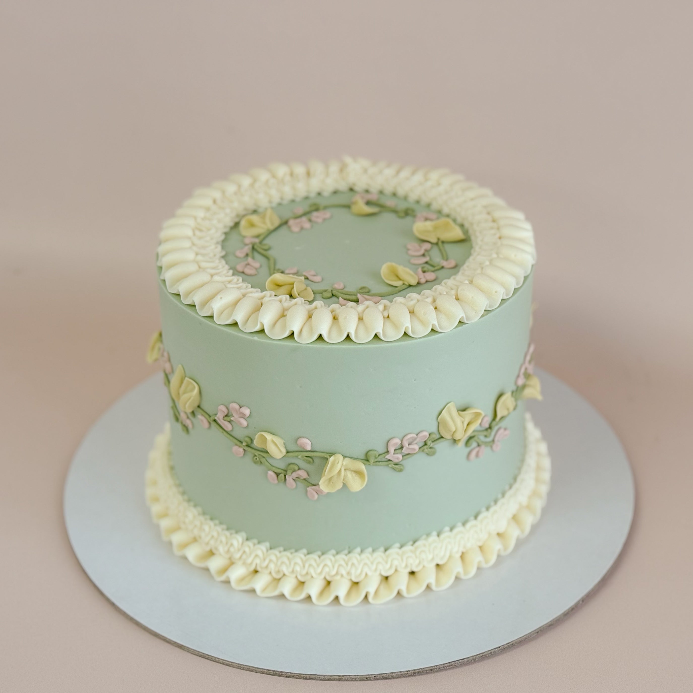 A classic vintage cake design with excess buttercream piping, frills, and flowers. Available in any of our signature flavours, and you choice of colours. (pictured in a 6" short single tier)